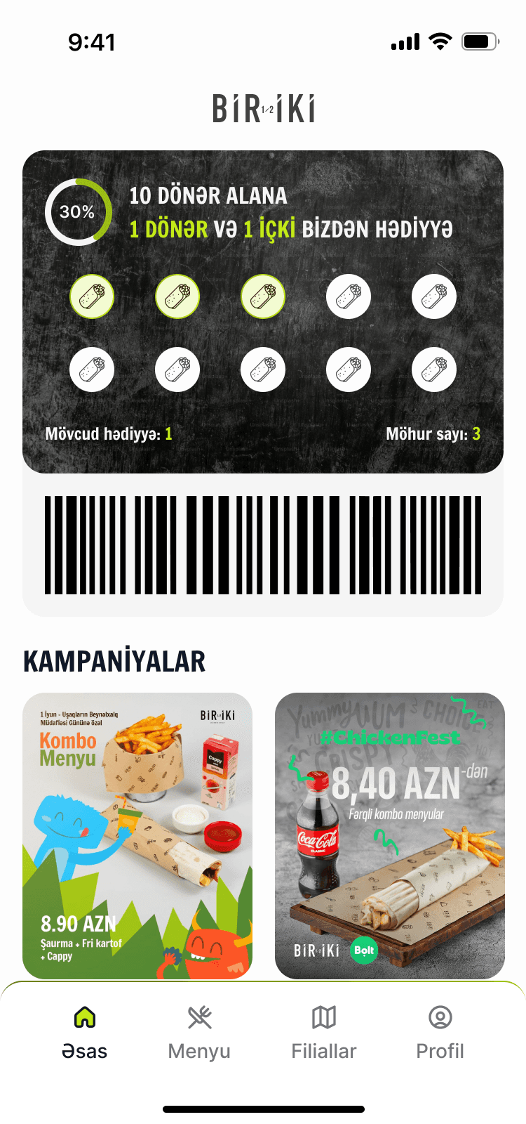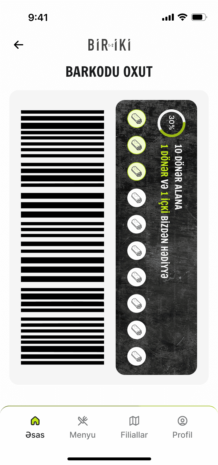 Bir-İki aimed to transform the dining experience by offering a seamless, customer-centric mobile app for its restaurant chain. The challenge was to create an intuitive platform that showcases the full menu, branch addresses, and a dynamic loyalty system. On the main page, users should effortlessly view their bonus points and a scannable barcode for earning rewards with every order, ensuring a smooth and engaging experience. Starting with no existing framework, every element of the app was carefully designed from the ground up to prioritize user convenience and brand consistency.